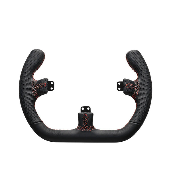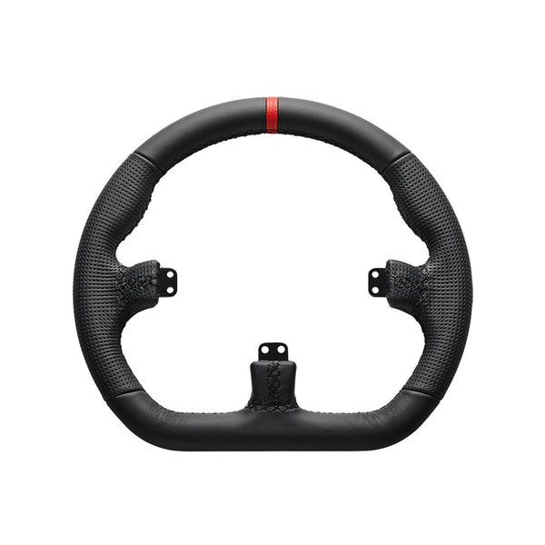 Versatile in design, it adapts seamlessly to your preferred racing style. Whether you're on smooth roads, mastering GT cars, tackling various terrains, or excelling in competitive racing, this rim is designed for it all. Crafted from high-quality materials reminiscent of real sports cars, this rim ensures both durability and authenticity. Feel the excellence as you grip genuine leather in your hands, immersing yourself in the precision and craftsmanship of our hand-stitched leather rims. The Closed D shape ensures more leg space, while not compromising on performance and ergonomics. This rim has a great ergonomic mold complimented by a high-quality leather material, which is perforated on the grips, making sure you have a steady grip on the steering wheel. All black leather with a red center indicator for a sleek and minimalist design.