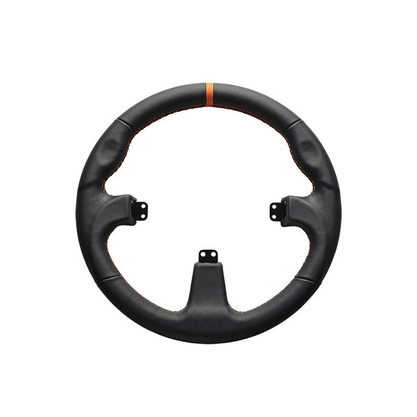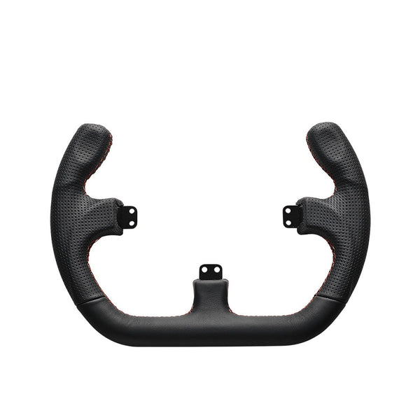 Experience the pinnacle of sim racing luxury with our handmade leather rim. Versatile in design, it adapts seamlessly to your preferred racing style. Whether you're on smooth roads, mastering GT cars, tackling various terrains, or excelling in competitive racing, this rim is designed for it all. Crafted from high-quality materials reminiscent of real sports cars, this rim ensures both durability and authenticity. Feel the excellence as you grip genuine leather in your hands, immersing yourself in the precision and craftsmanship of our hand-stitched leather rims. The Closed D shape ensures more leg space, while not compromising on performance and ergonomics. This rim has a great ergonomic mold complimented by a high-quality leather material, which is perforated on the grips, making sure you have a steady grip on the steering wheel. With orange-colored grips and center indicator, it makes for a stylish addition to your steering wheel collection.