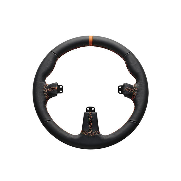 Experience the pinnacle of sim racing luxury with our handmade leather rim. Versatile in design, it adapts seamlessly to your preferred racing style, whether you're navigating winding roads, conquering GT races, tackling rally challenges, or mastering daring drift maneuvers. Crafted from high-quality materials reminiscent of real sports cars, this rim ensures both durability and authenticity. Feel the excellence as you grip genuine leather in your hands, immersing yourself in the precision and craftsmanship of our hand-stitched leather rims. Featuring top-of-the range ergonomics, while retaining a super stiff and rigid feel. Made from high quality materials. Black leather with an orange visual center point indicator, orange hand-sewn stitching.