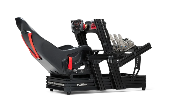 - Industry benchmark aluminum extrusion design with bespoke Next Level Racing end caps and T-slot nuts, Next Level Racing flex-free seat sliders, and custom Next Level Racing shoulder bolts